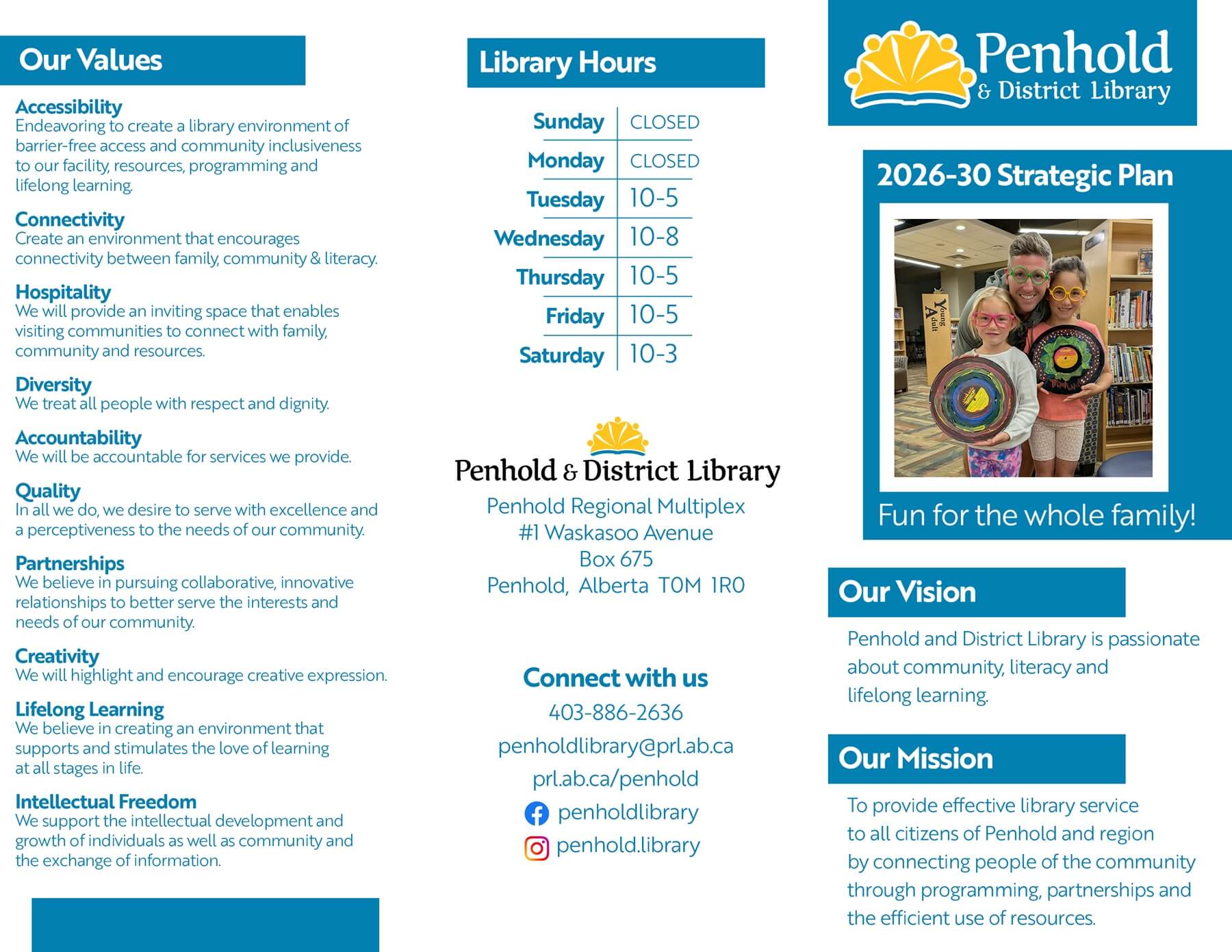 View our 2026-2030 Penhold Library Plan of Service. Thank you to our community for participating in our survey that provided helpful feedback that contributed to our current plan of service.